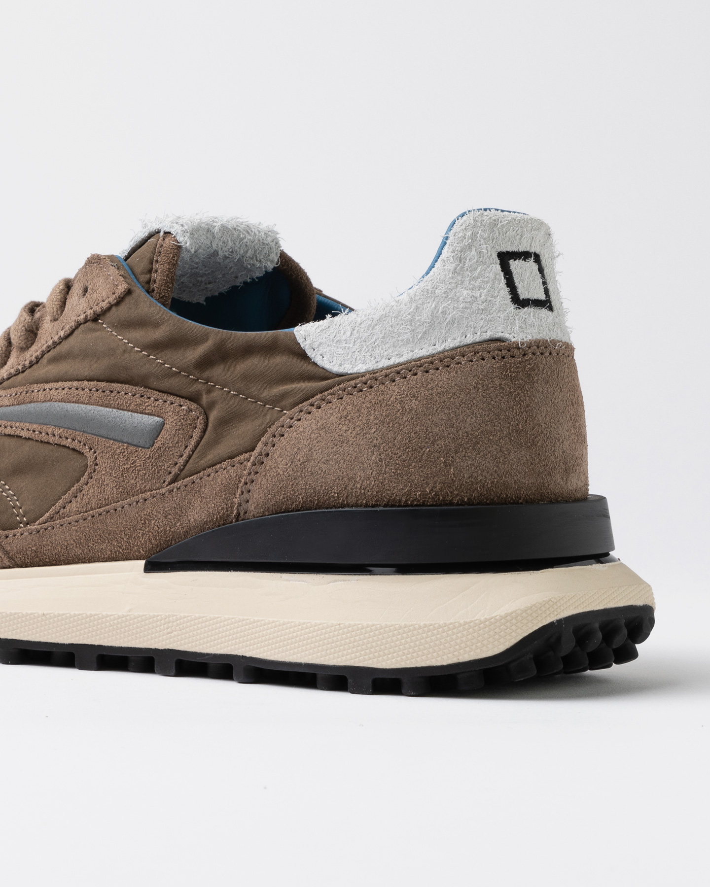 Logo carre' brode' sur le petit talon en daim hairy blanc.