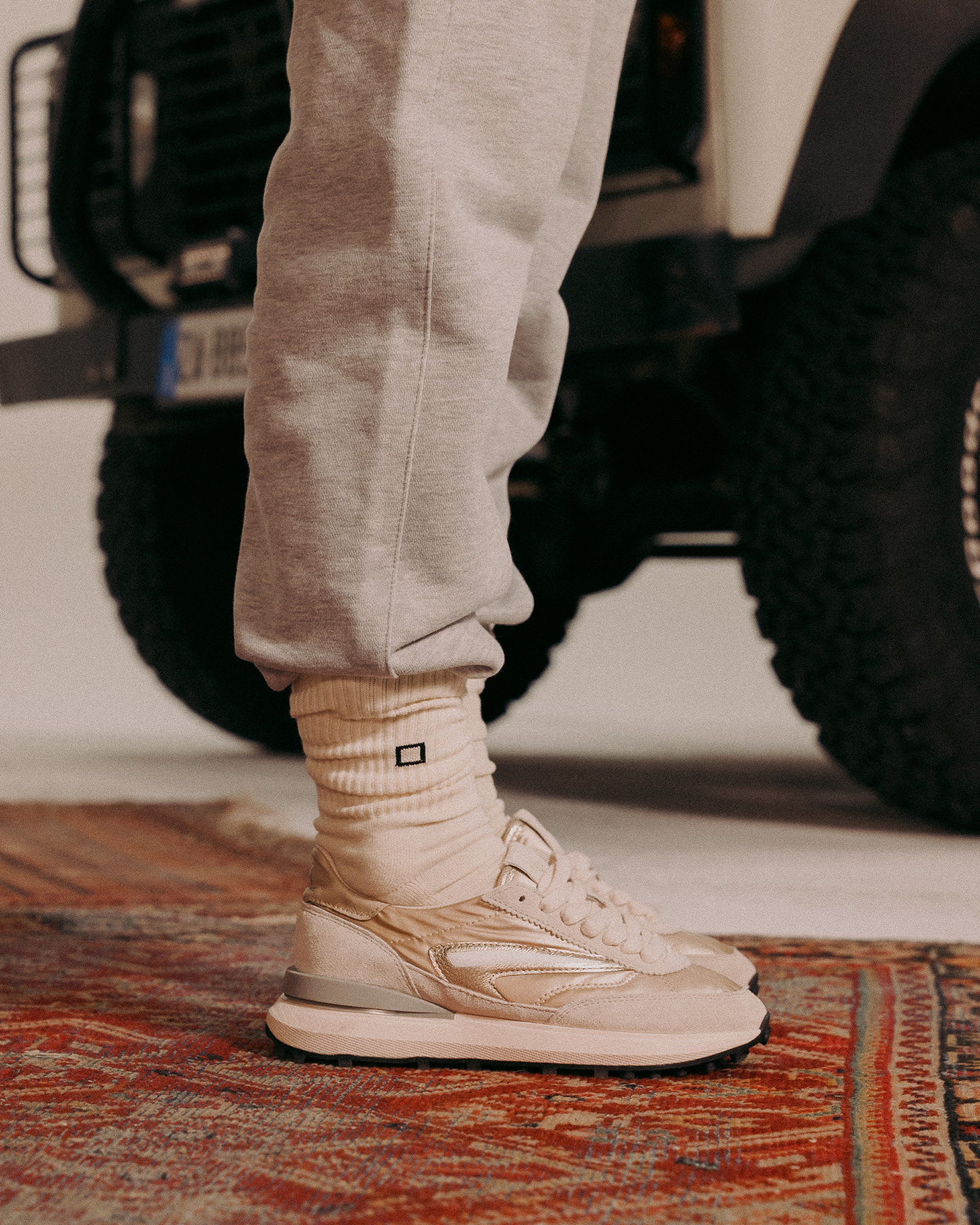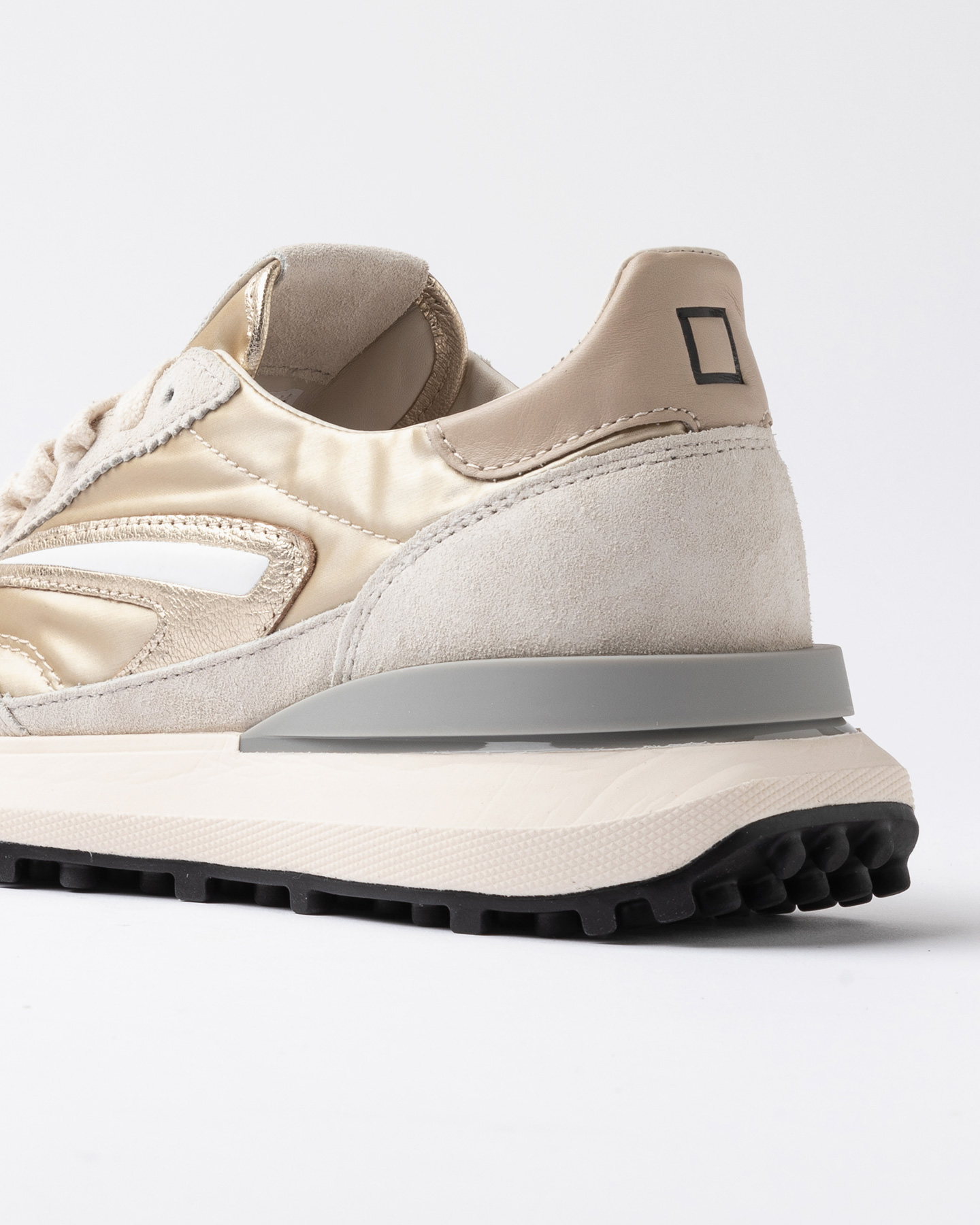 Running sneakers in tessuto laminato colore platino e suede colore avorio.