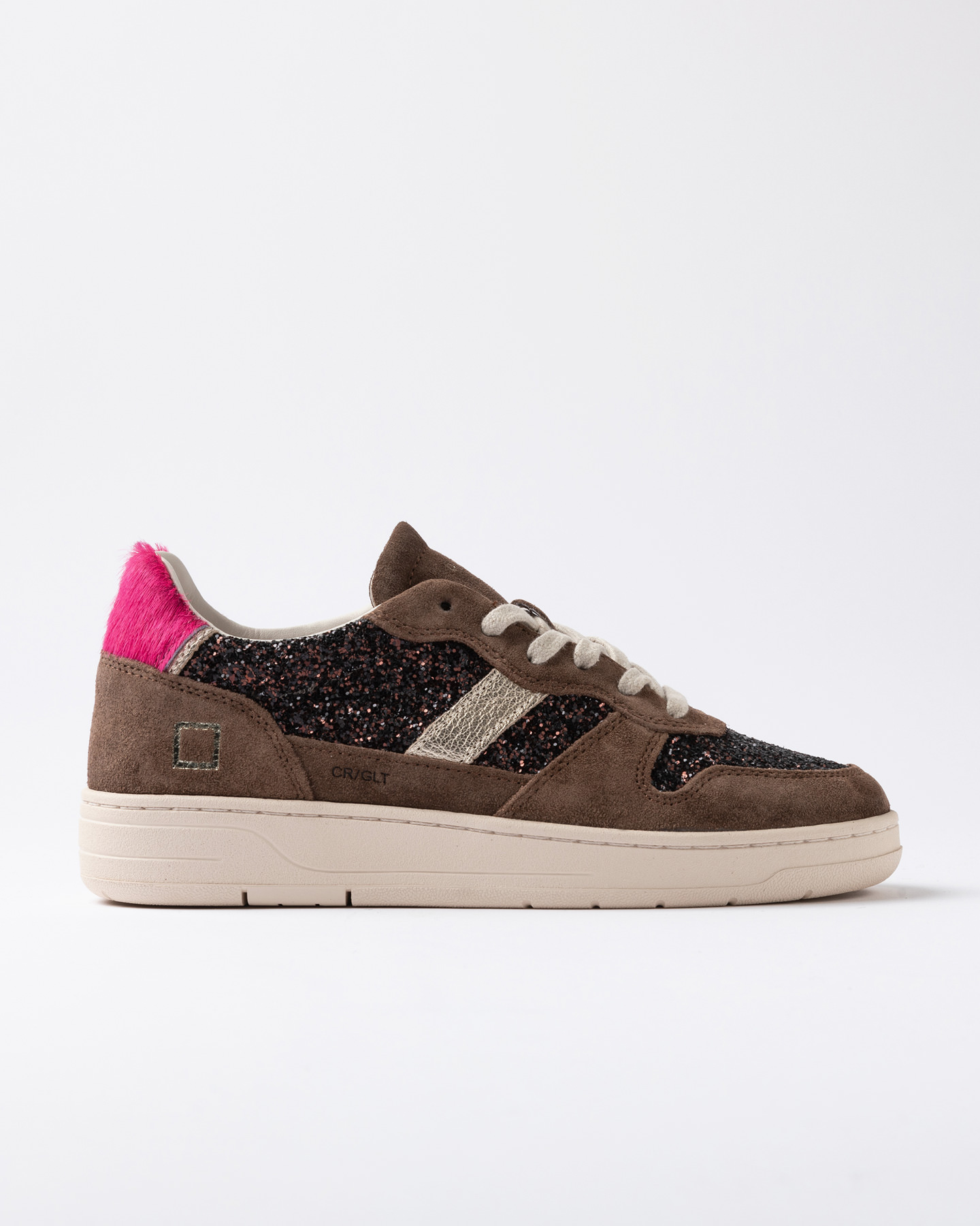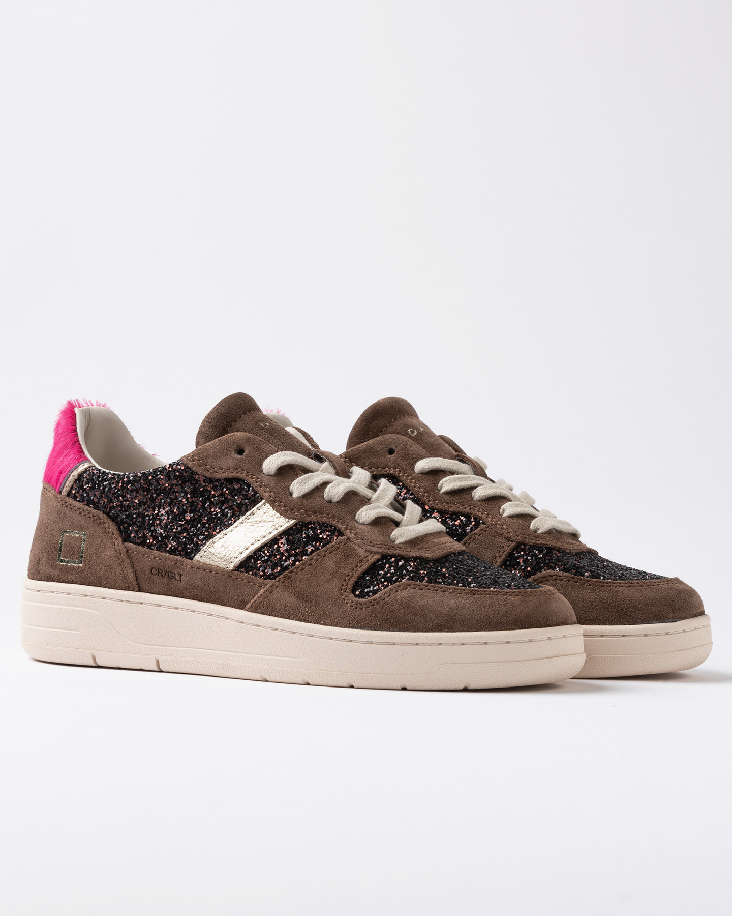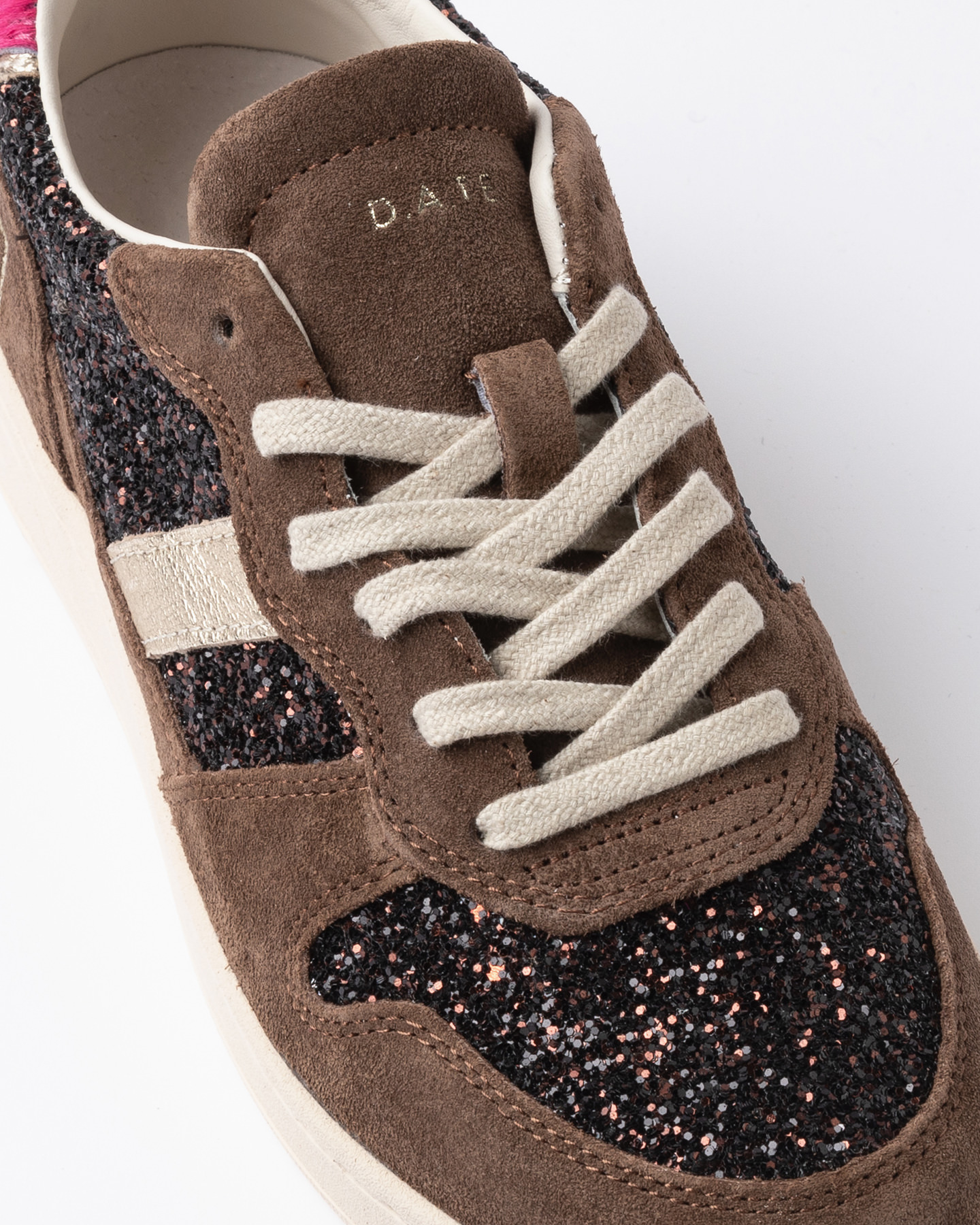 Sneakers bassa in glitter colore bronzo e suede marrone