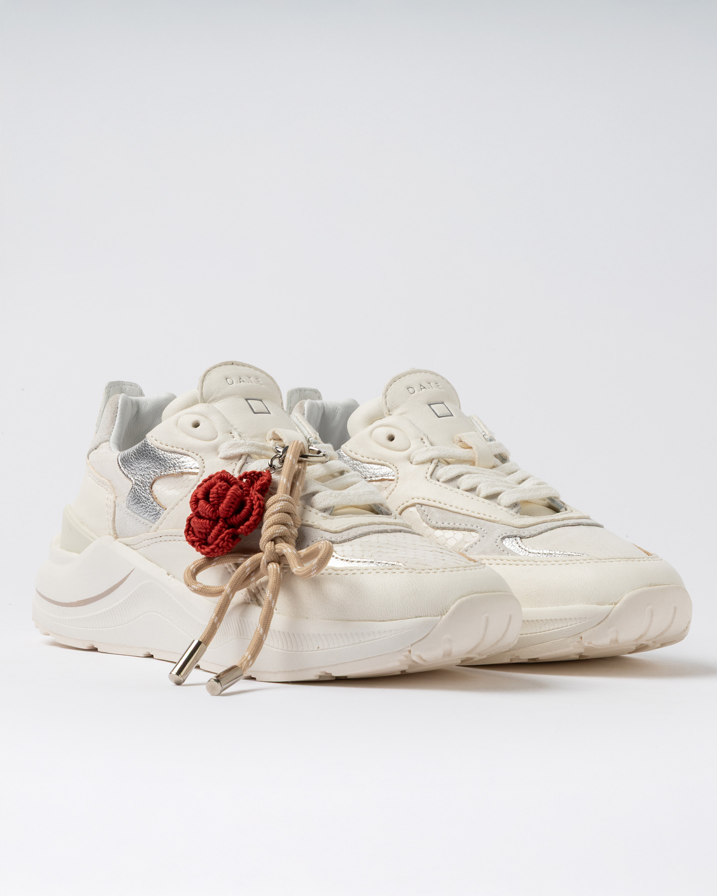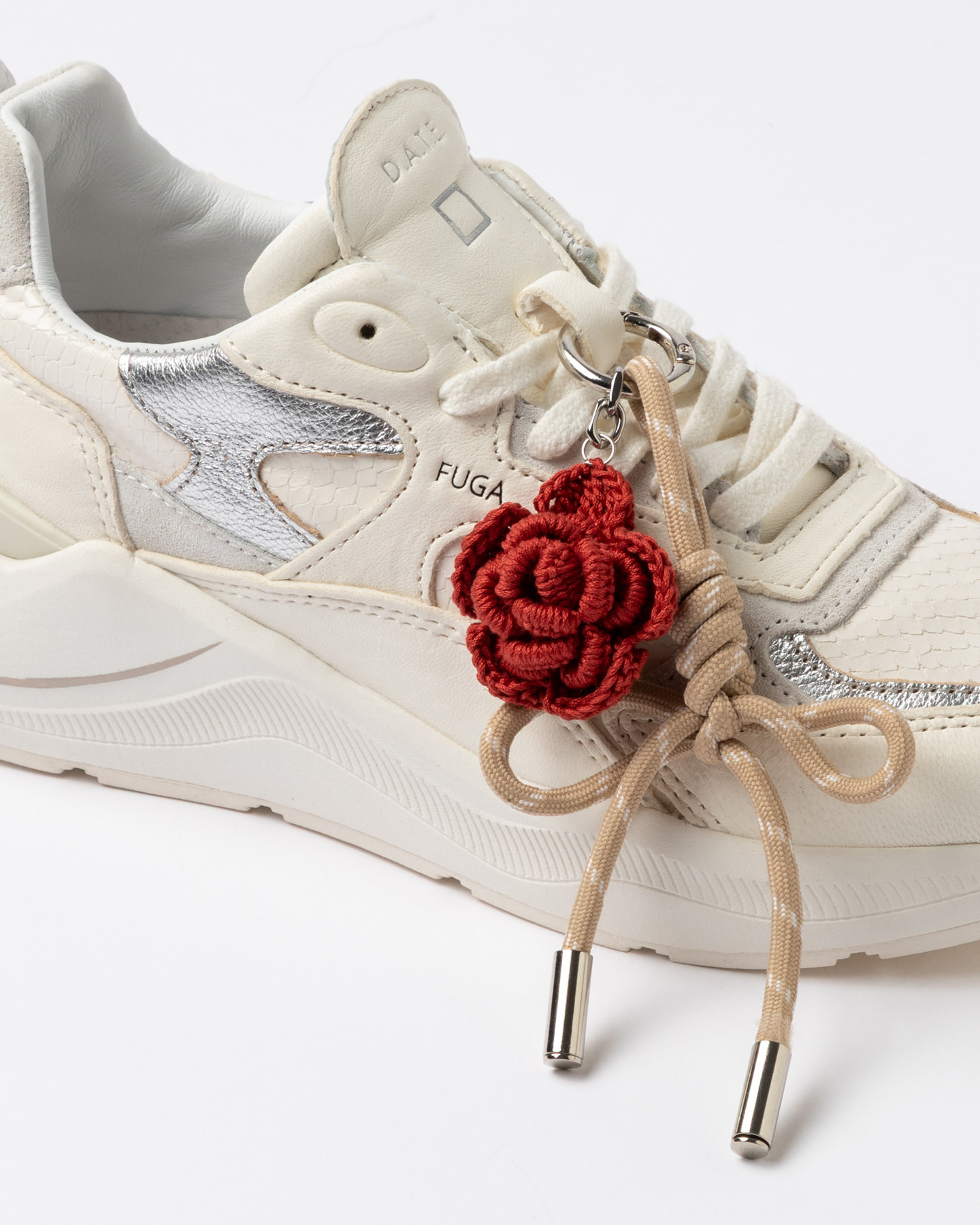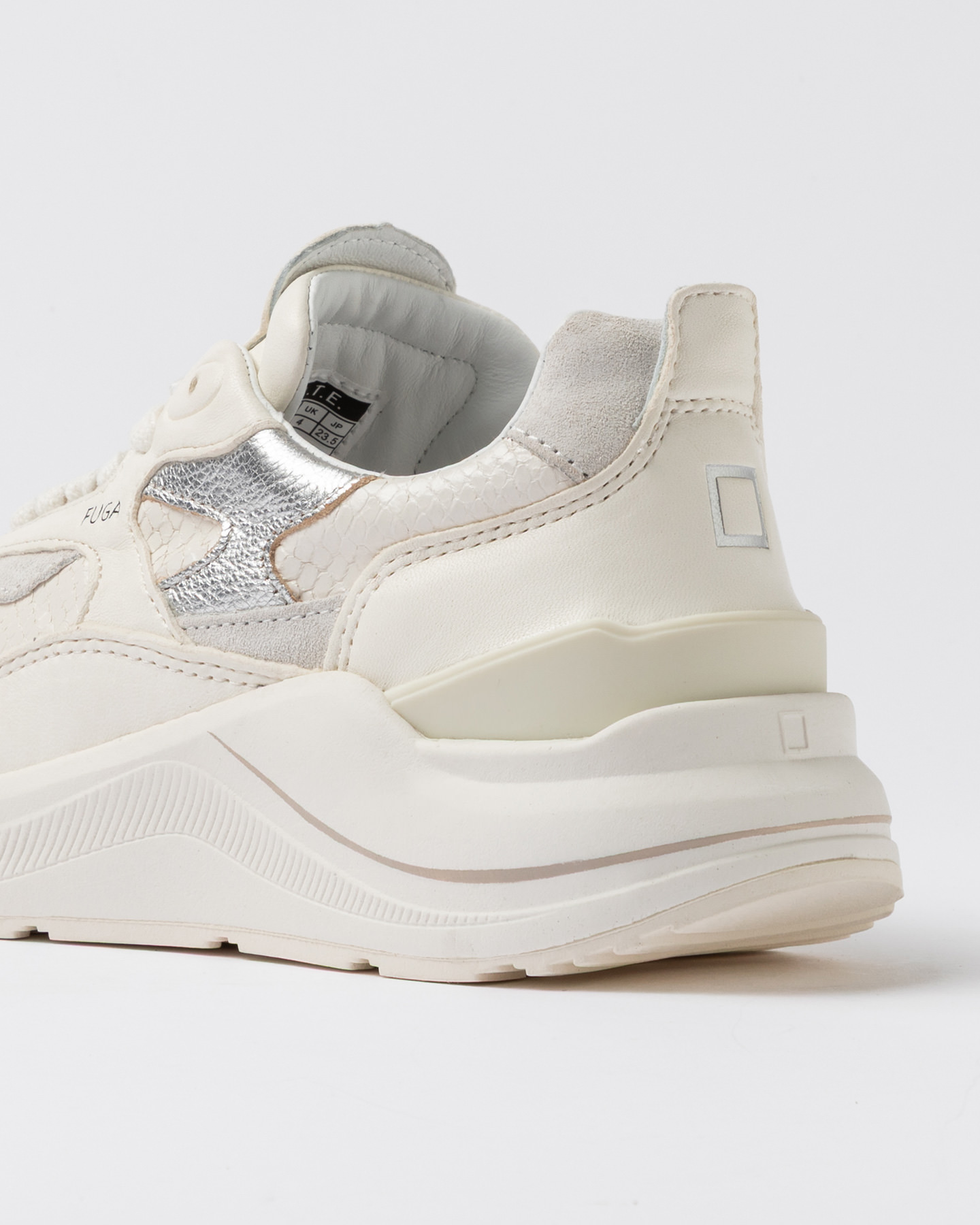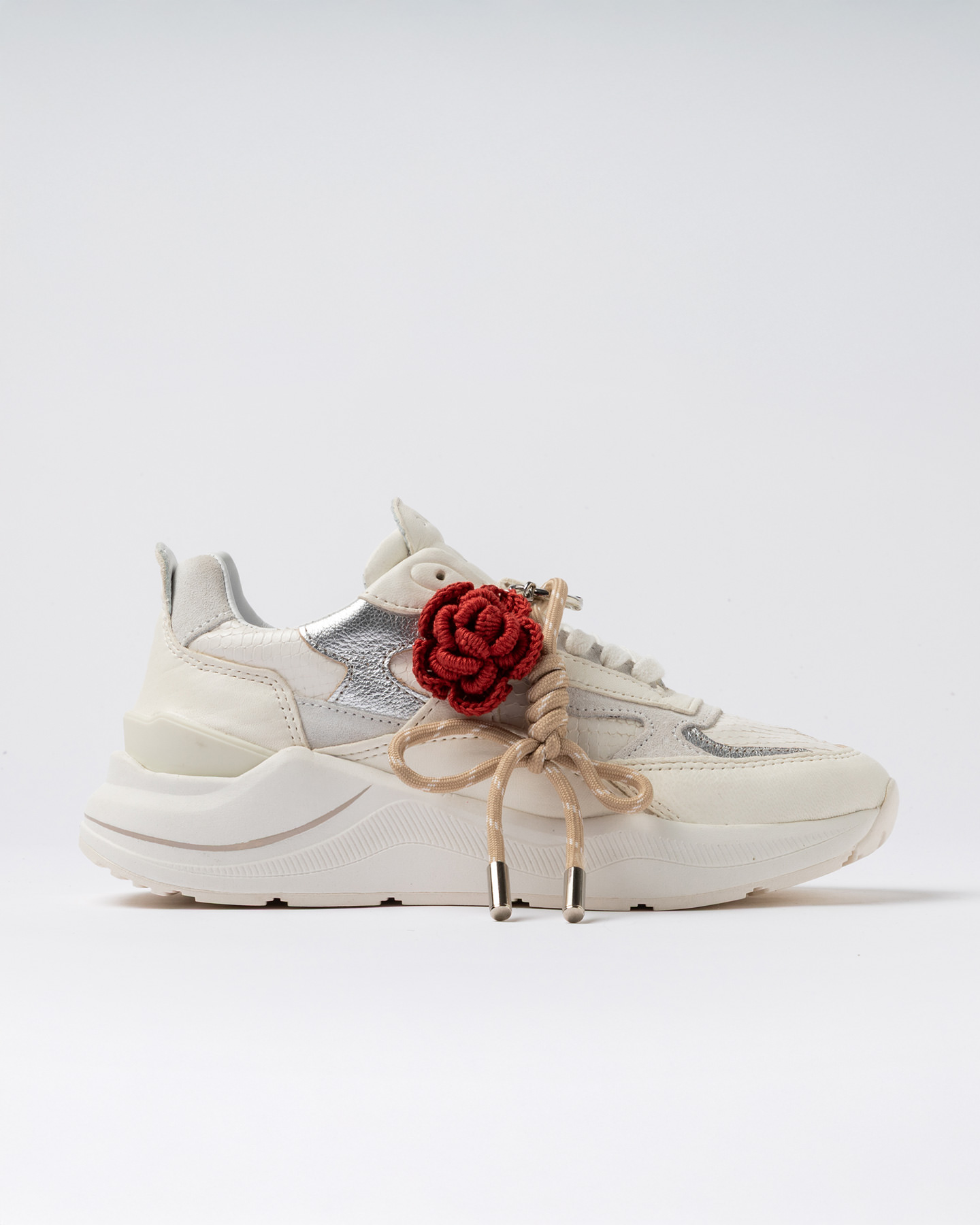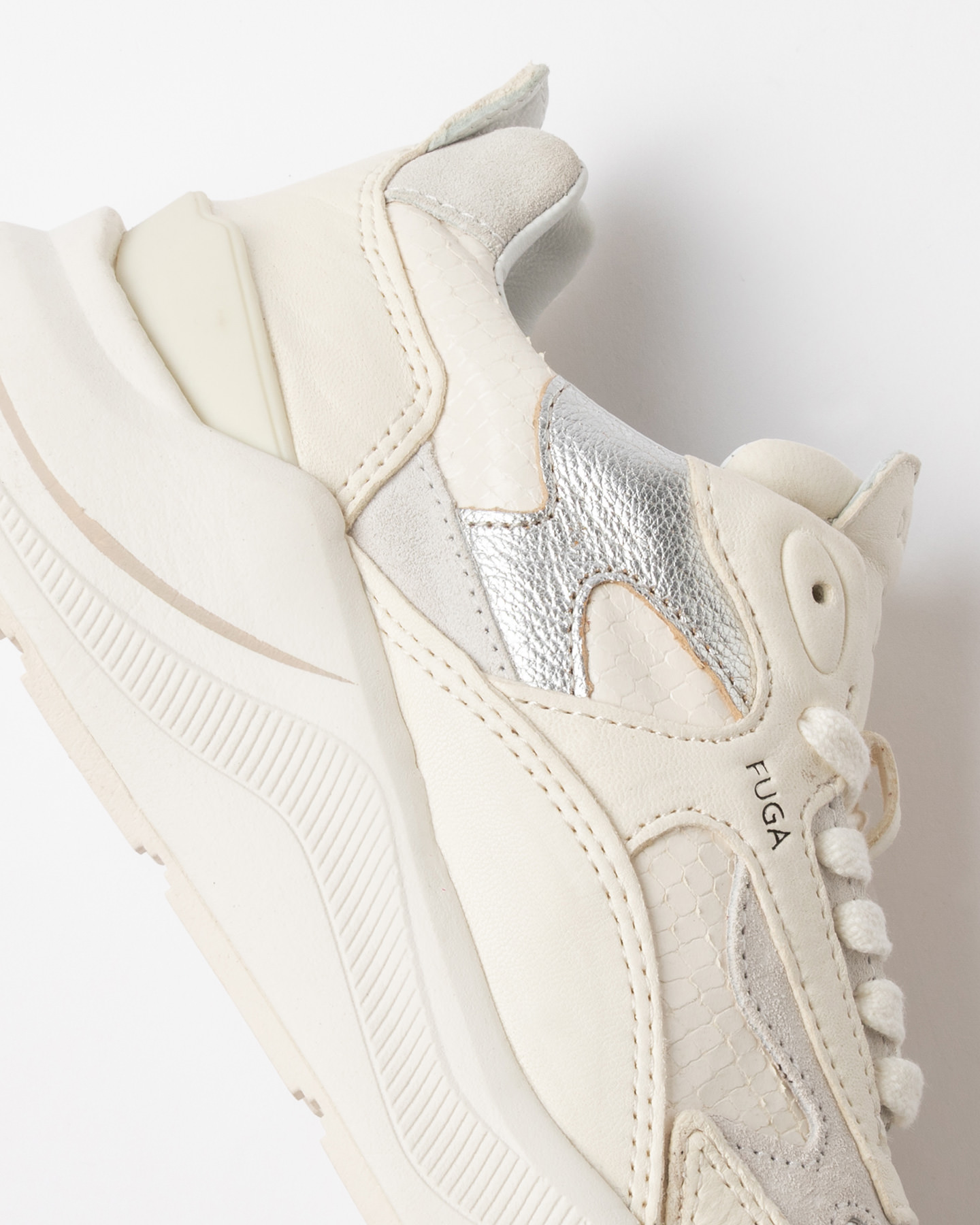 Inserti in pelle laminata colore argento e suede bianco.