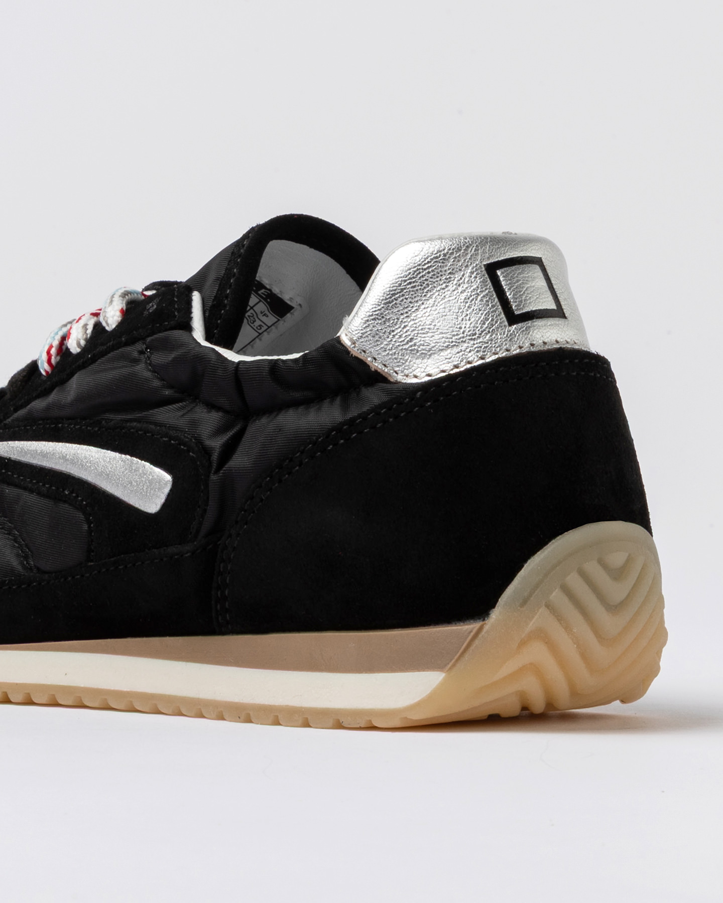 Il logo quadrato D.A.T.E. è impresso nel talloncino in pelle di colore argento laminato.