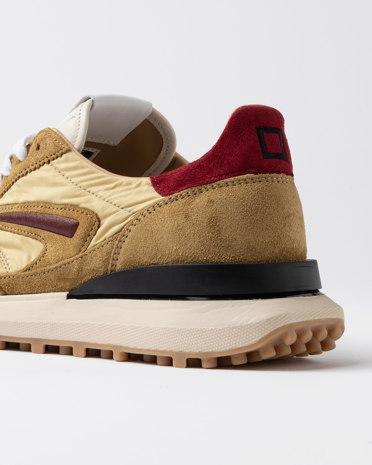 Il logo quadrato è ricamato sul talloncino in suede colore rosso.