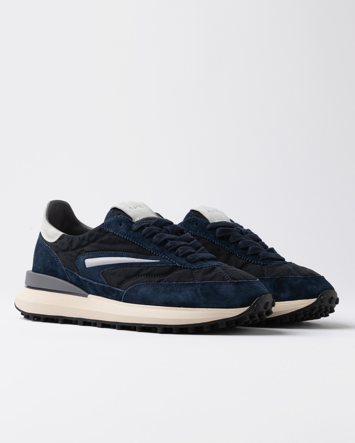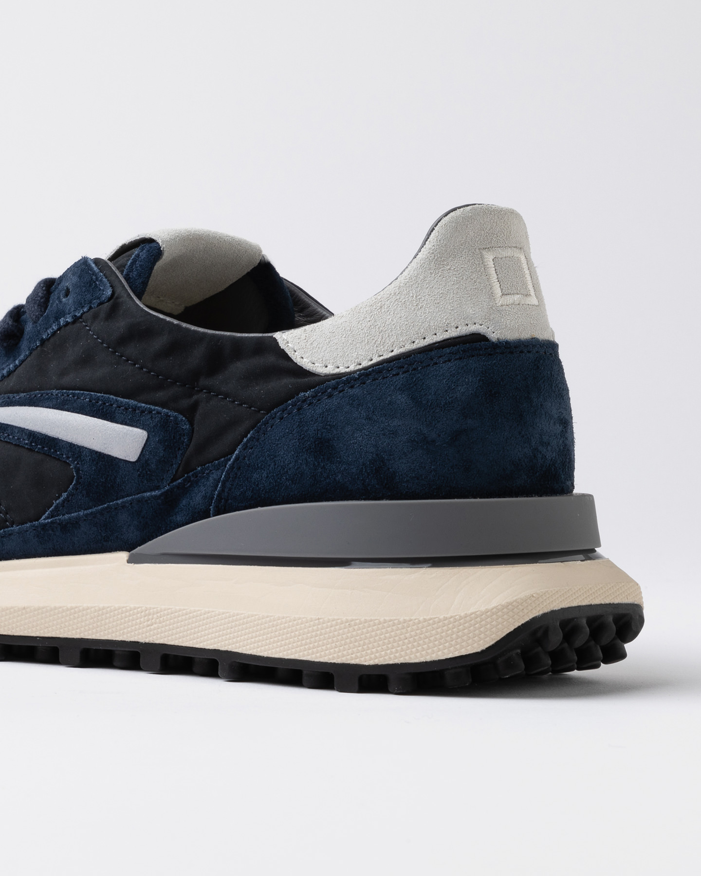 Il logo quadrato è ricamato sul talloncino in suede colore bianco.
