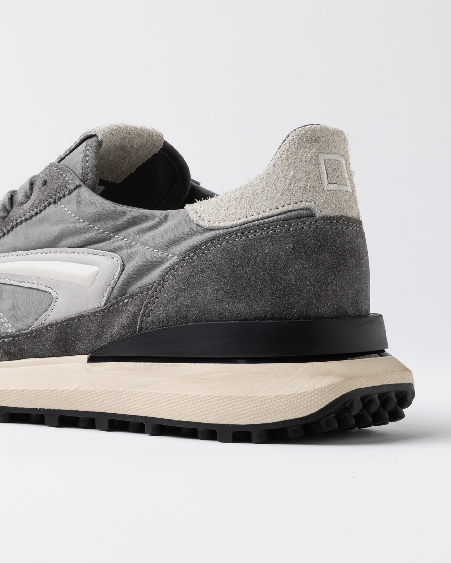Il logo quadrato è ricamato sul talloncino in suede hairy colore grigio chiaro.