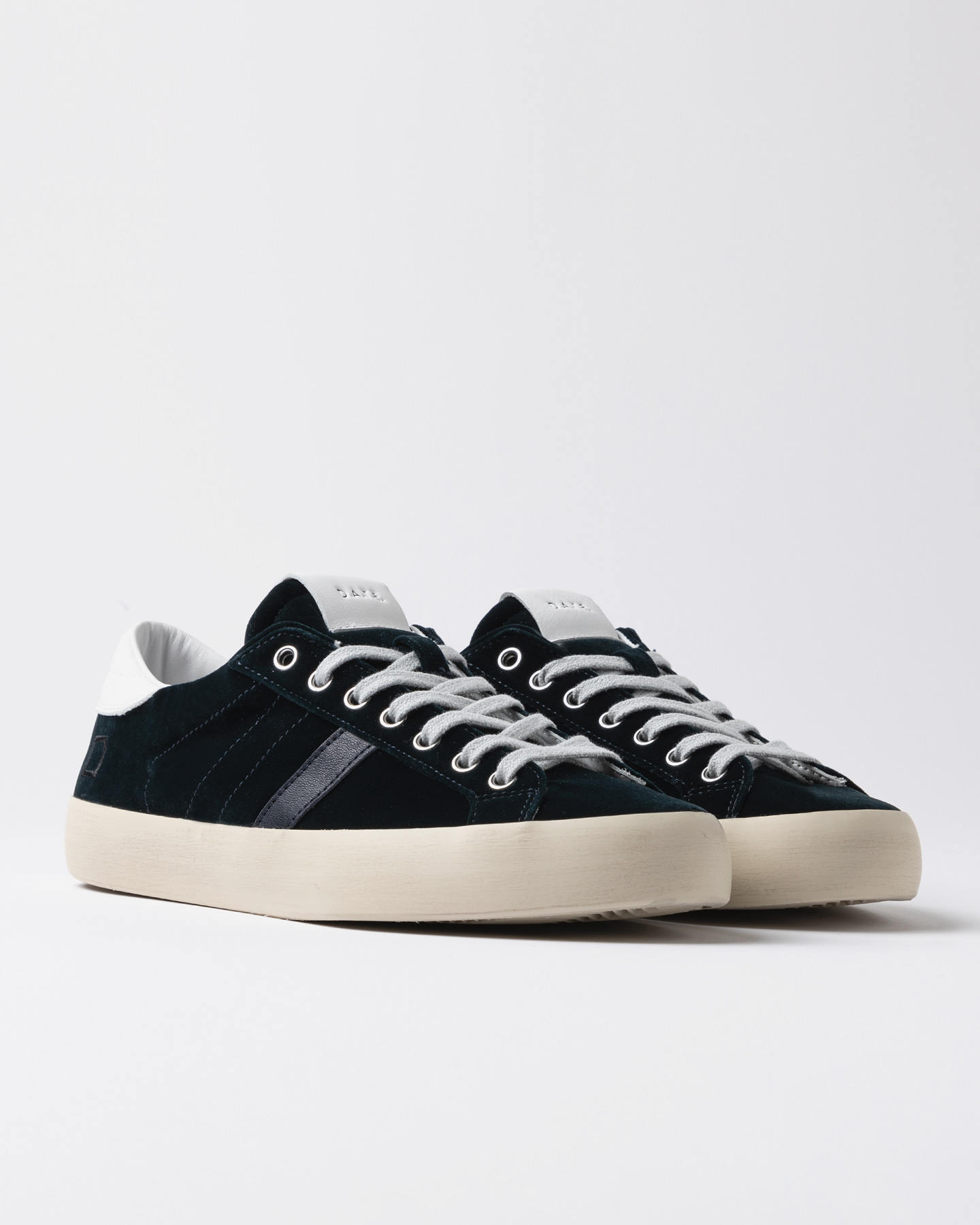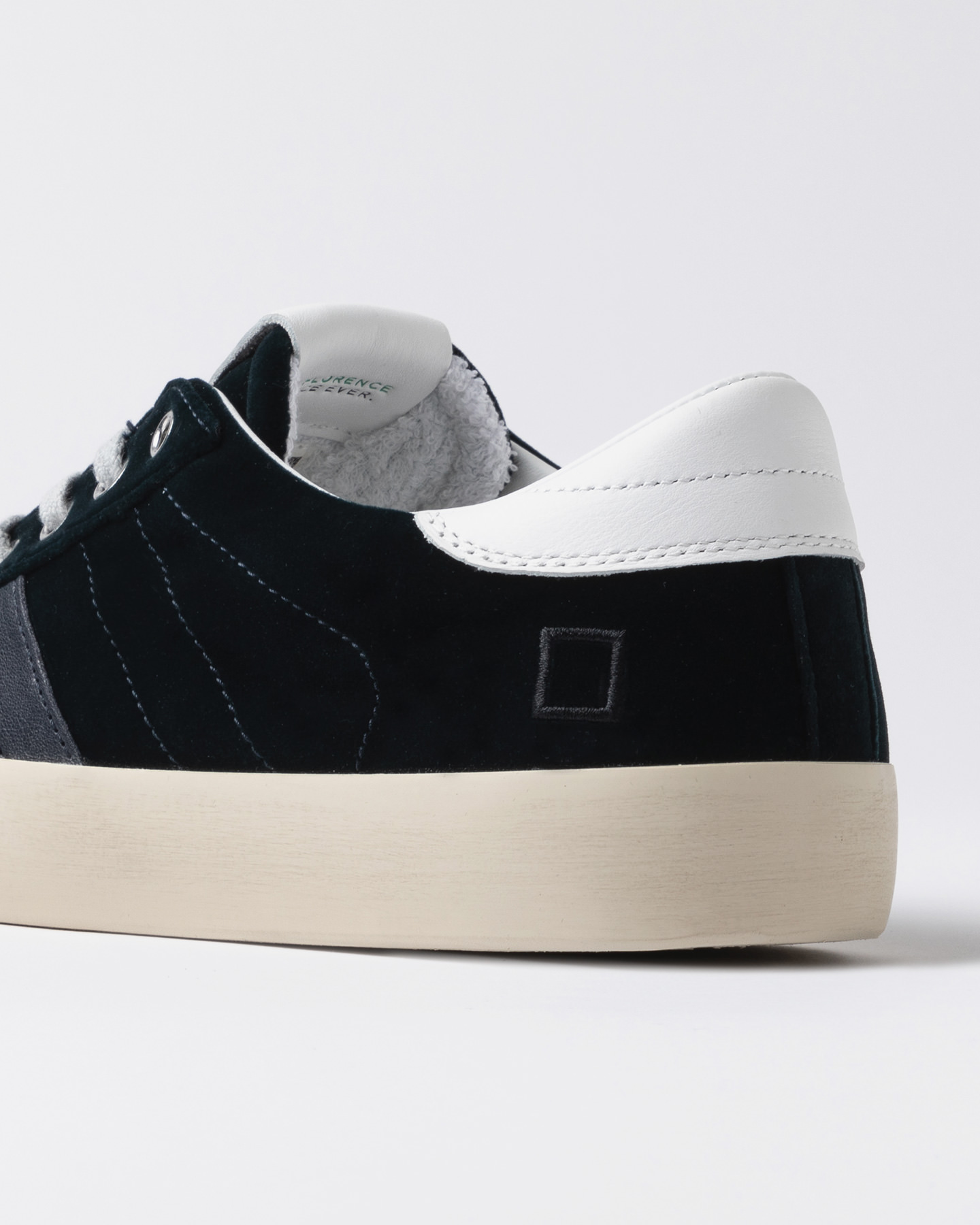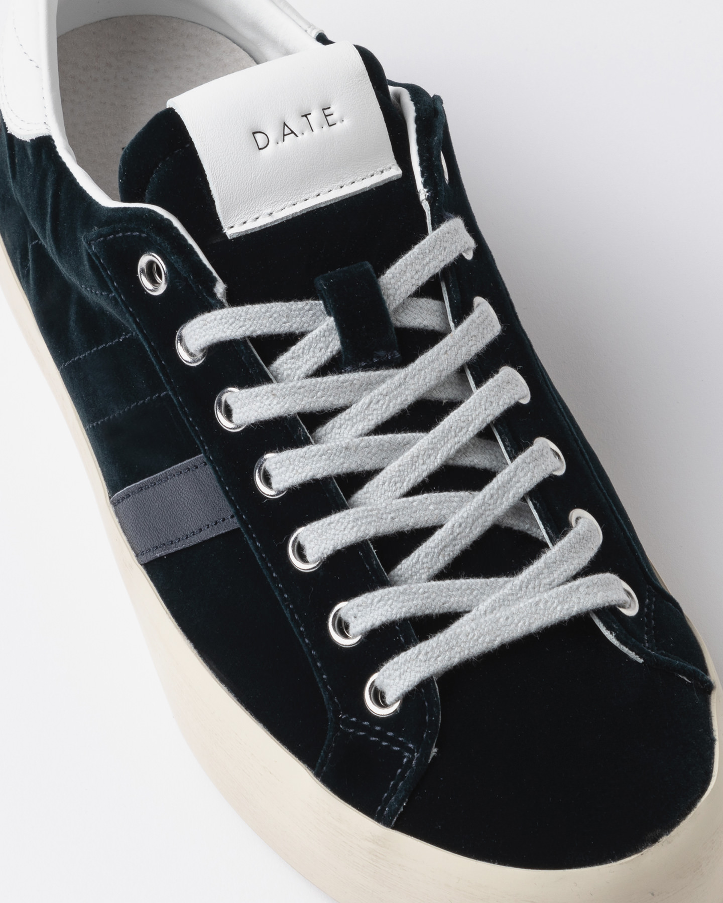 La label in pelle bianca, con impressa la scritta D.A.T.E., è cucita sulla linguetta in velluto blu.